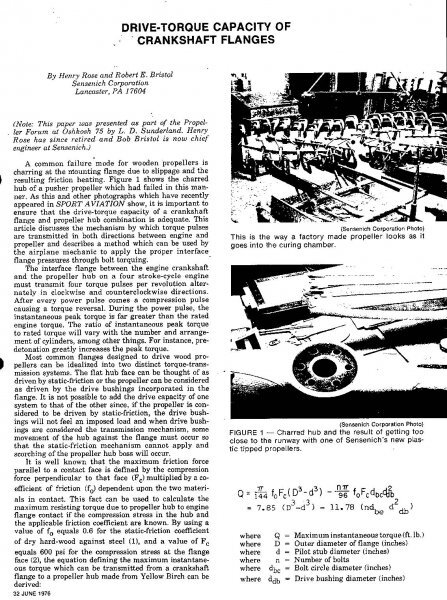 If you read the article by Rose & Bristol - I've managed to upload it, see below - and you know the crushing stress of the propeller timber - you can calculate the maximum torque your flange can transmit, and find the Belleville washer or washers acting in parallel, that give sufficient force at about 75% deflection. Then if you work back down the force curve for the washer, to about 50% deflection, you can calculate the minimum torque. It needs to have about 50% safety margin on the peak instantaneous engine torque, which you can estimate from FAR 23.361 - twice the mean torque, for a four-cylinder engine. If you cannot achieve this margin with the existing flange, the flange is too small. (The flange on the Seeker is considerably larger than the standard SAE flange on the Lycoming).
