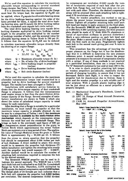 If you read the article by Rose & Bristol - I've managed to upload it, see below - and you know the crushing stress of the propeller timber - you can calculate the maximum torque your flange can transmit, and find the Belleville washer or washers acting in parallel, that give sufficient force at about 75% deflection. Then if you work back down the force curve for the washer, to about 50% deflection, you can calculate the minimum torque. It needs to have about 50% safety margin on the peak instantaneous engine torque, which you can estimate from FAR 23.361 - twice the mean torque, for a four-cylinder engine. If you cannot achieve this margin with the existing flange, the flange is too small. (The flange on the Seeker is considerably larger than the standard SAE flange on the Lycoming).Then work out the change in thickness of the propeller hub from about 5% moisture content to, say, 18% moisture content, and that will tell you what total travel you need for the washers between 75% deflection and 50% deflection, which will tell you how many groups of washers you need in series to maintain sufficient clamping force over that range of moisture content.
