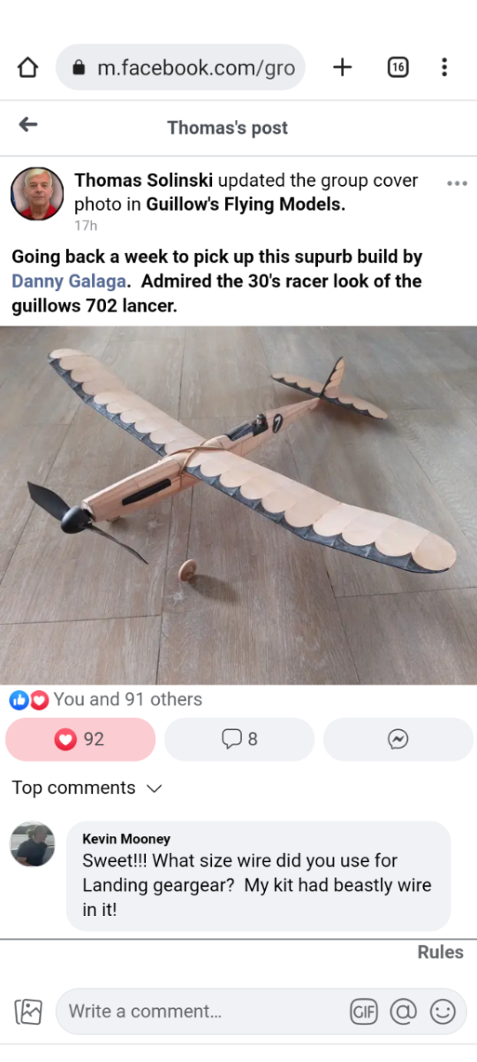 danny_galaga Posted Friday at 09:01 AM Author Posted Friday at 09:01 AM This is actually the last model I built, about three years ago. I didn't go hard core with proper FAI rubber, just the rubber in the kit so it didn't fly far or long. Just as well, I was just using a football field. I would have lost it 😄 I have much better photos somewhere, but here's a screenshot shot from FB 🙂 2 1