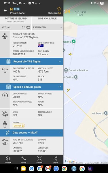 Thruster88 Posted 18 hours ago Posted 18 hours ago 15 minutes ago, coljones said: An FR24 screenshot - a C182 detected at Jandakot detected using MLAT ie no ADSB Out. OK so that c182 would have to be mode S or better to be transmitting the data. Have never seen an aircraft with no data showing which would be the case with a mode C or A transponder. 1
