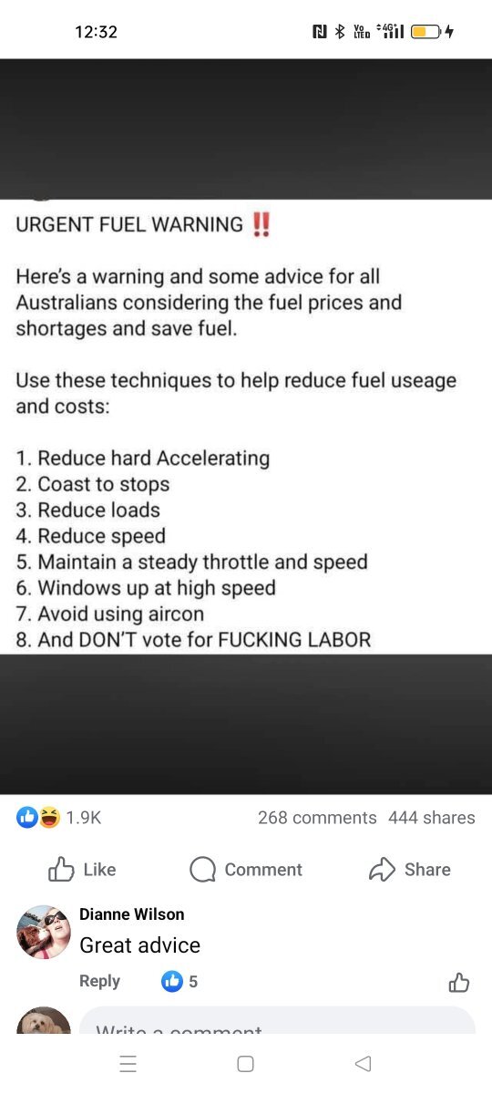 BrendAn Posted 15 hours ago Posted 15 hours ago (edited) 29 minutes ago, coljones said: 8. What an absolutely stupid comment! The Liberal and Country Parties have been equally remiss in their treatment of liquid fuels to the extent that they gave away LPG and, in his swansong, Taylor gifted our fuel reserves to the USofA (try getting that back from Trump) and shut down refineries. "Don't vote, for fucking Labor" might be a better slogan or even better would - It's a joke I come across not a comment. Sure stirs the lefties up. And my opinion is the same as Skippys. They all have their snouts in the trough, libs and labour. It just happens that we have the worst government in living memory ATM. Edited 15 hours ago by BrendAn 1 1