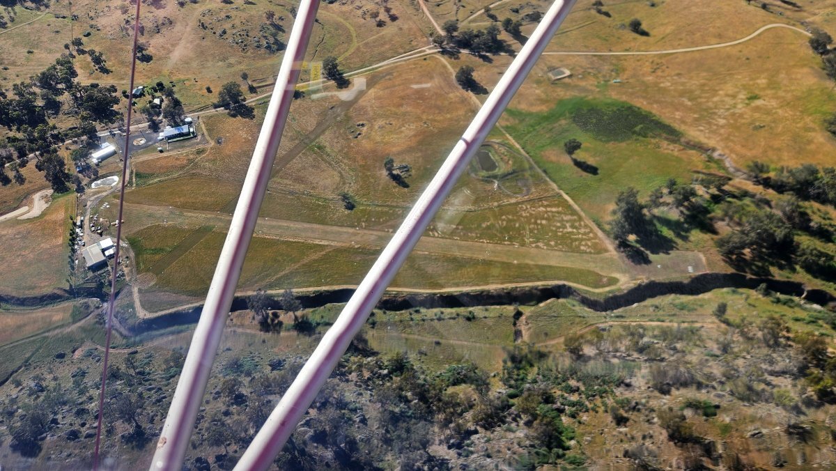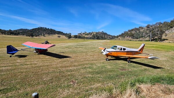 Had a nice fly in the mighty musketeer to a friend's strip in the hills for some Thruster flying this morning. The approach to the strip follows a curve in the creek valley, strip becomes visible on very late final and always looks very short. Good fun and the musketeer performs very well at light weight.17 points