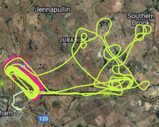 I didn't track my whole day because it was just more of the same. The purple is my Test Flight..... and I passed. 😇 The morning started out dead calm with take-off and landing from runway 14. I got told off for not doing a flyover on my solo return from the training area. The wind was up and had reversed so I actually landed down-wind. I had been away for an hour and never checked the windsock. By the time I got to my test there was a strong varying crosswind so my landings were a little less than smooth but I think I was given a bit of a concession for the gusty conditions. Tomorrow was meant to be the Sportstar test flight and my variable pitch propeller endorsement but the weather is likely to put a stop to that.10 points