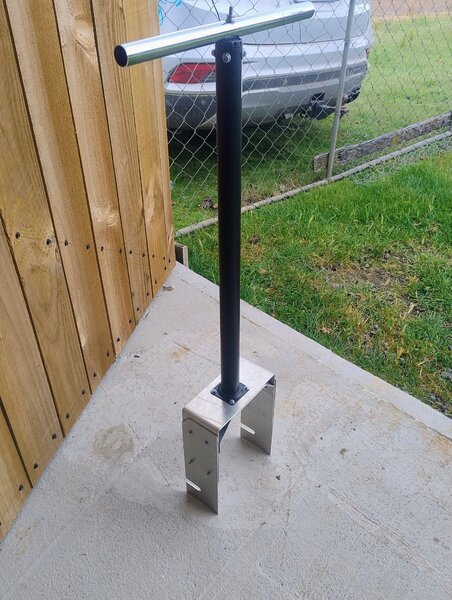 After dragging the plane in and out of the shed a few times, I decided to construct a tow bar to make the process a bit easier. Bent it up out of some 0.064" scrap, attached an old Bunnings table leg to it and put a cross piece on the end. I thought it may have been too short, but just tested it and it works a treat. Because it slides over the axle just inside the fork, it's easy to turn the plane too.10 points