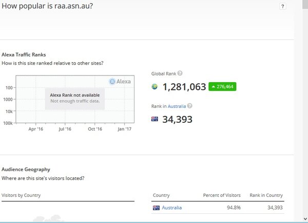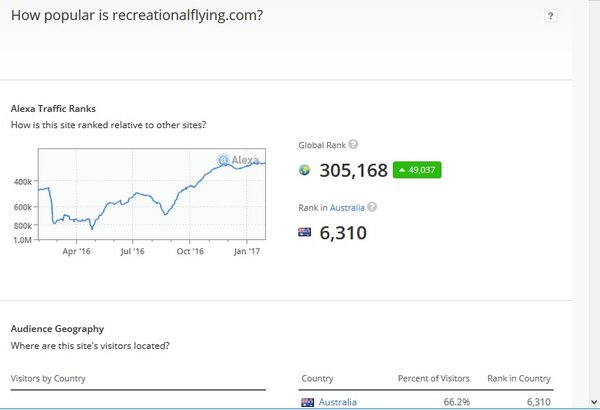 Back in August/September after reading the types of posts that were being made it got to a point where I just didn't want to read what was being posted as the site was not what I developed it for, I didn't even want to log in any more...it was very political with users attacking each other, nastiness, antagonistic and no longer were we basically discussing our fun flying times, and our aircraft. I then recalled what I created the site for and the site objectives from day 1 were always: 1. Increase our flying skills through information exchange 2. Help each to perform correct maintenance on our aircraft 3. Improve our flying safety by exchanging information about our own flying experiences So, the moderators and I have been working very hard but slowly to change the entire culture of the site back to one of why it was created, that is very friendly and helpful, talking about our flying fun and to uphold our site objectives. I am reading every single post again and enjoying what I am reading and seeing the types of posts that are being made and I personally thank you for helping to resurrect the site in this manner. The site figures have made a u-turn over the last few months, more posts are being made, the number of registered users that login each day has dramatically increased and many more new users are registering to use the site than before. We have turned the site from a continual downward slide over the last couple of years back to very positive increases in all metrics over the last 4 months. What is also pleasing is the increase in the site's Australian and world rankings and even more pleasing when you compare this site to RAA's own site...we are streaming ahead to the point that Recreational Flying is now ranked around the 6,000th web site in Australia and 300,000th in the world (that is 300,000th out of around 1 billion): Thank you to all and please be assured that we will continue our diligence in making Recreational Flying .com the most friendliest and helpful resource to all recreational aviators...keep posting and above all, help each other in our recreational flying endeavours28 points