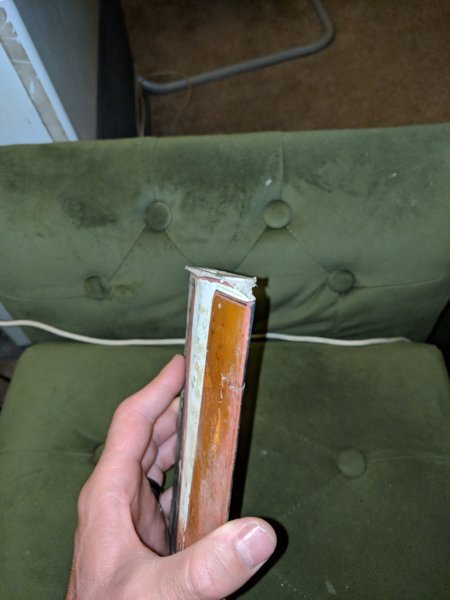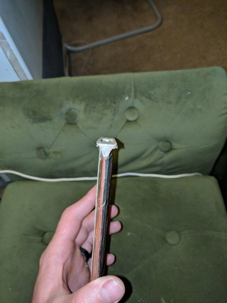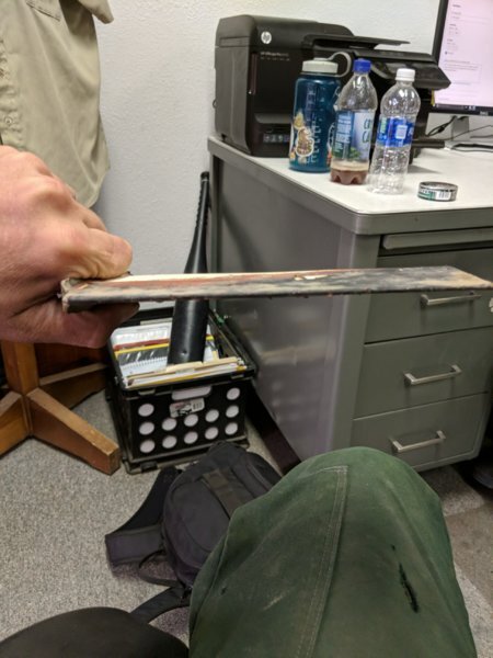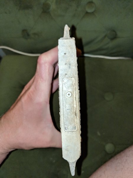 The burn marks are likely from a wildfire, since all the accident reports from NTSB for aircraft crashes in that area make no mention of a pre or post accident fire. Still is kind of weird though, cause I didn't see any real evidence of a wildfire being in that particular area. Usually you find small peices of burnt wood, or stumps or something even from really old fires. Perhaps I didn't look hard enough though. Anyways, I'll attach some more photos of it. On one end there seems to be edges that kind of protrude perpendicular to the main structure of the peice, and on that same end there's a very small hole that runs right into the peice length wise and it has a little plastic housing. I'd really like to get this postively identified as a peice to a plane though, because so far my research into crashes in that area are a bit inconclusive.