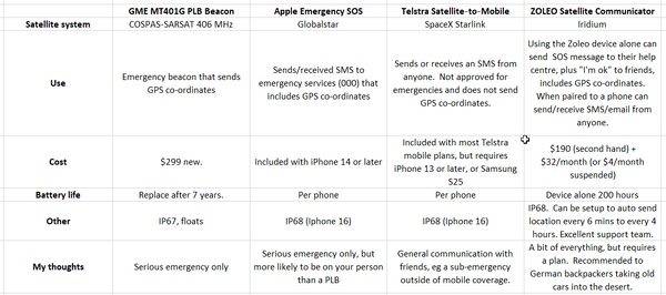 On the weekend, I noticed "satellite" appearing on my phone two different ways whilst flying and using Avplan (with SkyEcho + ADSB). I thought I would investigate and share the findings here. The first image at 2:57 pm is my Telstra iPhone indicating I can send SMS by Satellite, albeit with a reasonably weak signal. After some investigation, this will show when you can't get a connection to the normal Telstra network, but can connect to Starlink, so SMS will work not apps or voice calls The second image at 3:10pm is my (any-mobile-provider) iPhone indicating I can send Apple emergency 000 messages via their GlobalStar coverage. This means I was most likely in a gap between Starlink satellites, which is generally only a minute or so, but there was a Globalstar satellite visible to my phone. Since I also have a PLB in the aircraft, and a Zoleo (mostly used by my daughter for hiking), I thought I would put all four options in a table. 00AD270A-D18D-498B-8BD4-F65C4730A9F7.SNAG