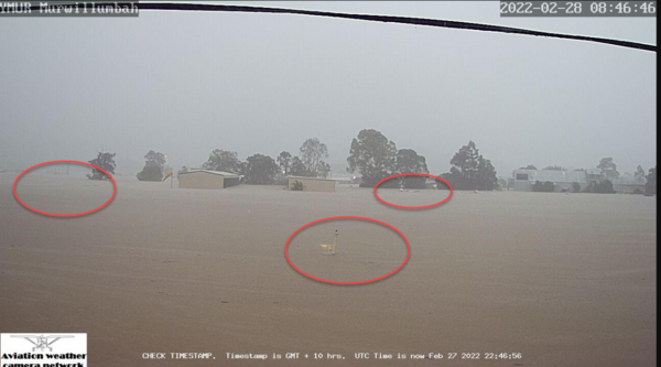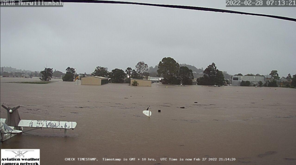Sad. In the middle of the photo is the white top of someone's fuselage, a vertical and part of a black prop. To the left is a flying boat. I had a chat to this owner when I visited December, (at that stage he was putting the finishing touches on the restoration and preparing for a first flight - the Tweed River is not too far away) In the background, on the other side of the North-South runway, are two hanger buildings also well underwater.