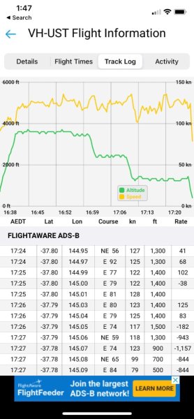 Thanks.. We did buy a regular PLB, which I hope goes unused. I also hope that in the event of an emergency my mobile phone network traces, Av-plan logs, "find my phone" app, mode-C records and the NAIPS-filed flight plan all prove useful in narrowing down a location. I probably shouldn't worry as I suspect statistically an "incident" in near proximity to an airfield is probably more likely. BTW still haven't worked out which public websites receive our NAIPS flight plan information ie RAAus scheduled arrivals/departures at regional airfields.