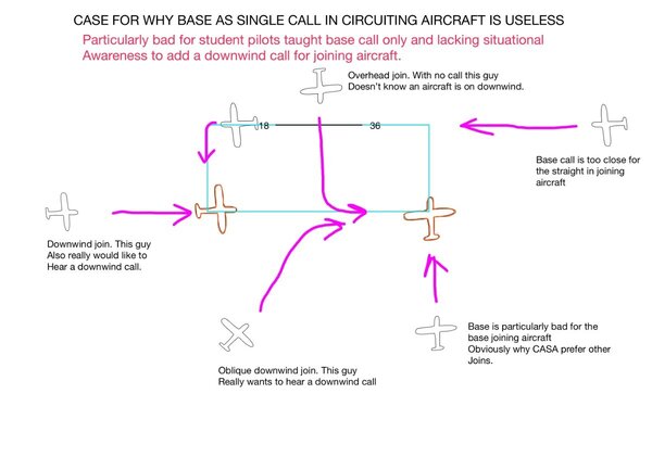 I’ve made up a diagram to make it simple. And…. I’m going to make contact with CASA to discuss. If anyone has a good contact within CASA I’d appreciate a PM Note… if I’m conducting circuits at an airport with a particular call such as base only I’ll just call my base because that is what is expected. I’ll call downwind if incoming aircraft. I’ll call final if I have a suspicion the taxiing aircraft that’s at runway departure might want to sneak out. I’ll call final if I’ve joined behind another aircraft that might be worried I’m too close so they can relax and concentrate on their landing. Rare occasions and subject to the number of calls I’m hearing in circuit. But…. If CASA had a recommended downwind call as single call it would make everyone’s life easier. Schools would become consistent. Calls around Australia would be more predictable when coming in to an unknown airfield. I started this thread with a degree of uncertainty due to my limited flying experience and some difficult encounters with a few indivividuals….. well… one individual. I’m now very certain. Some 750 hours flying in 2 countries and 7 years. The current radio call procedures are at some point going to cause some of us so,e really near misses or worse.