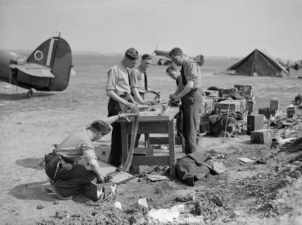 1. Ground crew and armourers refill ammunition belts with .303 bullets. Aircraft in the background are Hawker Hurricane Mark 1s of No. 85 Squadron RAF at Lille-Seclin.