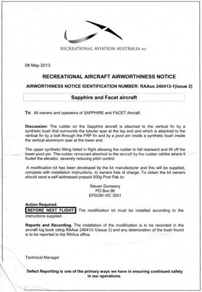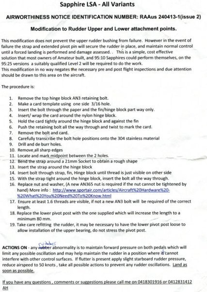 4. Hi Geoff, Attached images show the AD info for updating the rudder. There are phone numbers for Steve Dumesny at the bottom of the second page, but don't know how current they are now. Alan