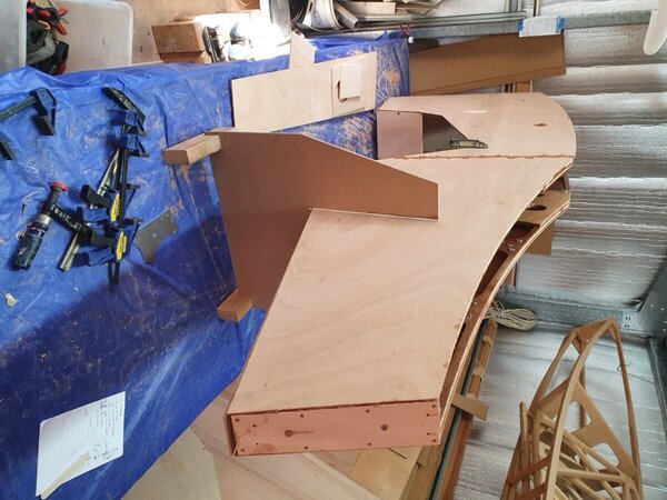The skins are jigsawed together (my router can only handle half a sheet) and clamped to the airframe. And before someone asks, the odd-shaped pieces in the photo below is the seat doubler, to address the potential weakness at the point under the pilot's bum.