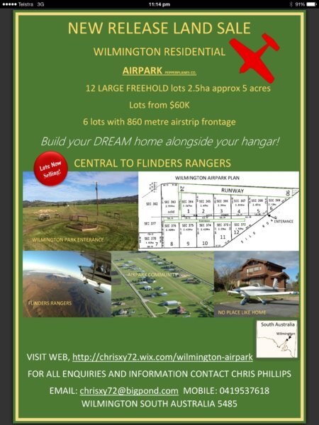 Hi where to start? Wanting to let everyone know about a new Airpark land release at Wilmington south Australia. Please visit http://chrisxy72.wix.com/wilmington-airpark