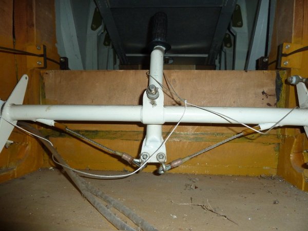 The rudder cables were - as you said straight forward. Elevator I am still working on, but I had a breakthrough when a friend sent me some pictures of the inside of his machine. Some angled pulleys has made for a neat system, so I will try to replicate that. He also had an issue with the aileron cables. As he moved the stick fore and aft the ailerons moved as the cable was tensioned. Both ailerons going up or down together. He has solved that by routing the cable from the bottom of the stick through the torque tube (picture attached). I am going for steam gauges, simple, reliable.