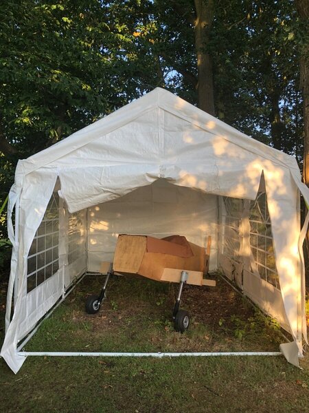 With spars and undercarriage, it doesn’t fit back in the workshop! Quick plan, erect a tent in the woods and see how it goes! Next major job is fitting the spars, making sure I get the correct angle of incidence. Trial fits so far show the slightest change makes a big change to the angle. No absolutely sure how I can get a consistent angle, take it apart, apply glue and get it back together again with the correct angle.