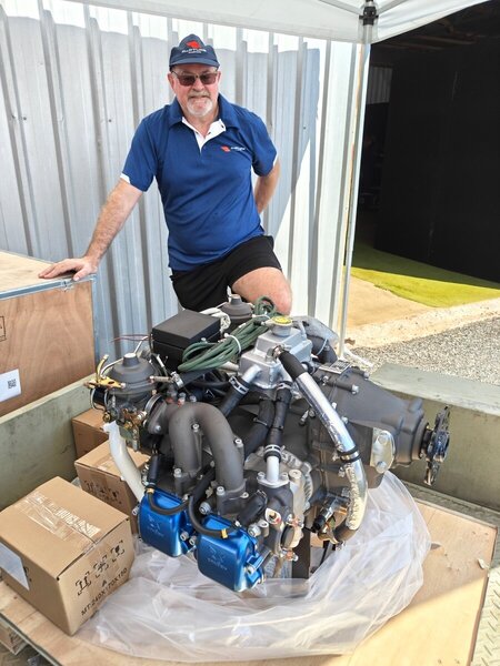 For those that didn't make it to AusFly, here is a photo of our 110hp CA510 minutes after we opened the crate which had only arrived in Adelaide a few days before the event and we were that busy that we didn't open the crate until we had arrived at Wentworth. Luckily, it was all there and in excellent condition. The fine specimen of a man watching over it is Milton, owner of the yellow Lightning Bug who by the way is selling that Bug to help fund getting the next Bug flying with a Zonsen engine in it. The boxes that came with the engine contained the accessories that we ordered with it such as mounting rubbers, etc. -
