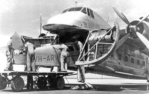 Correction:- It was not a Cessna 172 as stated above. On November 16, 1957, Rockhampton proudly received as its first aerial ambulance, a Cessna 182 (pictured), during an official handover ceremony at Connor Park Airport. Tragically, on June 7, 1958, the aircraft crashed in thick scrub near Edungalba during bad weather, resulting in the loss of all four occupants on board. Another notable visiting aircraft to the Rockhampton Aero Club in 1957 was a Percival Proctor VH-ARV from the Aero Club of Southern Tasmania, Cambridge aerodrome, Hobart (pictured twice, airborne and once being eaten by a Bristol Freighter on its way to Melbourne).