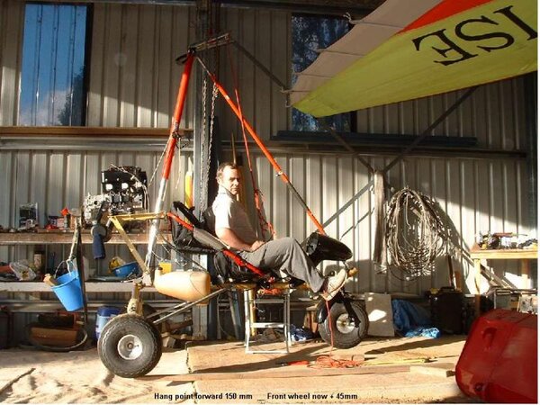3. I finally got around to doing a hang test yesterday afternoon (including pilot in seat). Boy was I shocked to see the rear wheels 100mm off the ground before the front wheel started lifting. I seem to remember some "Old Salts" of pilots who'd flown Buzzards before mentioning that they tended to do "3-Point" landings, (as opposed to later, more evolved trike designs which land the rear wheels first) but this was rediculous !!! ;-( I have no intention of flying a trike that wants to land nose wheel first every time. I thought up some theories about force vectors and how the trike base interacts with the wing but in the end realised the only real definitive way to get through this problem is to do a comparitive hang test on a trike base known to have good manners. So we did a hang test on our Edge-X 582 trike base. The result was the front wheel was 100mm off the ground as the rear wheels start to lift. HHHMMMMM !!!!! Back to the drawing board . . . DEEP in thought as I went for walks and installed a couple of trivial things like steering damper, exhaust safety wire, connected the brake cable. To raise the nose in the hang test the hang point must move forwards. I made up a frame That bolted to the hang point at the top of the mast and was held down at the front by rope to the front of the base tube. I inserted a bolt a various distances forward of the heart bolt hole as the "new" hang point for testing. A "new" hang point 150mm forward of the heart bolt hole gave what I deemed to be an acceptable result of the nose wheel being 50mm off the ground before the rear wheels lifted. Although this is only half the height achieved by our Stock-Standard Edge-X 582, there is some more weight yet to be added to the rear of the Buzzard, namely propellor, battery, regulator, carbs, bucket of lead ;-) Also of note is that the mast angle from vertical is only about 11 degrees, compared to about 18 degrees on the Edge-X 582. I haven't made the changes yet as I want a week to think about it and seek guidance and feedback first from others who have owned, flown, modified Buzzards. Contributing factors: 1. Tundra tyres and forks hold the front of the trike 105mm higher and the rear of the trike 30mm higher. In the hang test that puts the front tyre 75mm closer to the ground before the back wheels lift, compared to the original Buzzard tyres and forks. 2. The Rotax 503 engine is lighter than the original Rotax 532 + radiator + coolant (??? I think). My solution: Making the seat frame 40mm shorter and shortening the front brace tube to suit will bring the top of the mast forward by 155mm. That doesn't affect the seat space for the pilot, only for what was originally a passenger seat space and as a Buzzard can only be rego'ed as a single seater these days that slight loss of "rear seat" space is no longer an issue. The new Edge-X mast and front brace tube (modified) are the same dimensions as the original Buzzard items so the result of the first hang test yesterday was a big suprise. However, with the different (Tundra) tyres and forks and lighter engine some change should have been expected. Photo's of hang tests will be posted in the next few days, have to wait for them to be emailed to me. Suggestions and comments are welcome . . . Cheers, Glen