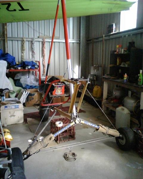 22. My Buzzard now sports a brand new mast and front brace tube. The FUN part was pre-stretching the internal safety cable with about 300kg of force and locking it in place with the tubular bush through which the bolt goes which connects it to the plates either side which bolt onto the base tube. It's a "Back bone connects to the Hip Bone" song kind of thing.:star: Thanks to the rack on the quad bike, a few stray lumps of wood, a 5ft steel pipe lever, some big D-bolts and a 2nd pair of hands, the pre-stretching of the cable became possible and was uneventful. Some basic geometry was engaged to ensure the hangpoint stayed in the same place to avoid trike type COG issues. Basically, if the 3 sides of one triangle are the same length as the 3 sides of another triangle, then you're looking at 2 identical triangles. The front brace tube needed one extra hole drilled and the old hole cannot be accessed with the seat frame locked in place. The rear suspension swing arms were re-installed and the front seat mount was bolted back on and seat frame mounted to it. Looks much better now with a bit of strategically placed paint.:thumb_up: I'm a bit concerned about whether the Tundra forks will fit on the Buzzard base tube and am just awaiting a reply from someone who has restored a Buzzard before and seems to have replaced the forward section of their Base Tube with an Edge-X part.(That's right, I'm not the first) Anyway, I did end up visiting Airborne on Friday morning. I realised that I'd be spending my next 3 weekends elsewhere and resolved to get as much done as I possibly could this weekend. The weather forecast for next weekend looks good so hopefully my friend will be flying his Cessna to his property near Taree and I'll be coming home from there with some more good bits for the Buzzard. Namely a Wizard Wing and some Tundra Tyres & Tubes and a possibly a detailed design of rear wheel drum brakes for trikes, if not an actual kit or an undertaking to make another set for me . . . :big_grin: Cheers, Glen