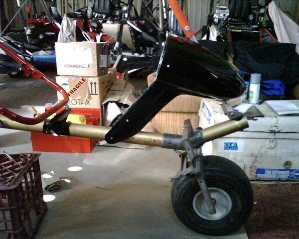 11. Some good progress was made this weekend with plenty of bits having arrived from Airborne last week. The Tundra Forks and front axle-wheel-brake assembly was completed and fitted to the front of the trike. To aid this, the best method of installing new wheel bearing was discovered. ( By pre-heating the aluminium wheel to 200c in the oven and chilling the new bearings to -18c in the freezer, they simply dropped into place without any further mechanical encouragement being required). :thumb_up: Gearbox oil was sourced at Supercheap according to the Rotax manual specifications and the required 120mL was put in. The gearbox plug was inserted in the top and safety wired. The exhaust system came back powder-coated last week and was installed onto the motor with the required high temperature anti-seize carbon grease in the joints and the springs were safety wired. Seat belt was fitted to the base tube and fed through the seat. The Instrument binacle pod was fitted properly this time by being bolted to the base tube with all the tidy saddles and bolt caps from Airborne. Instruments have been fitted into the panel which is separate and I'm still waiting for a good altimeter which is a couple of weeks away. Am back to trying to source a replacement fuel tank from Quicksilver within the next month. Failing that, the alternative is to get a new fibreglass tank made up which will be more expensive but would allow for an increase in capacity over the 25 litres of the old tank, using the old tank as a guide. Might be an idea to check what marine tanks are available. Cheers, Glen
