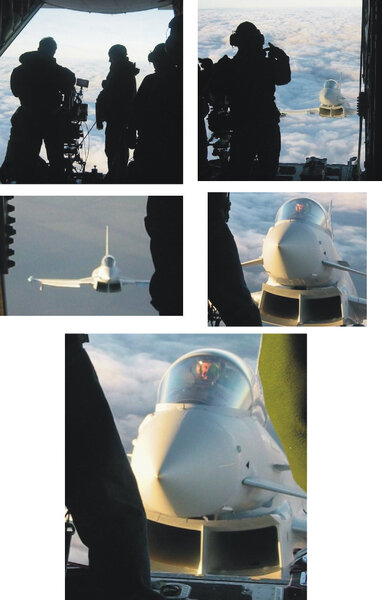THAT'S CLOSE ENOUGH! Come closer, I can't see the whites of your eyes ! This give a whole new meaning to aircraft recce. Nice nose shot of the new Eurofighter Typhoon from the "back door' of a C130 for PR pictures. Pip.. Pip.. team! [ATTACH]1127[/ATTACH]