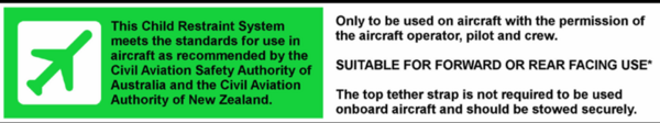 10.7 CASA and Standards Australia collaborated to modify AS/NZS 1754 to consider the CRS fitment in aircraft. CRSs certified to AS/NZS 1754:2013 and onward, can meet additional criteria relevant to use onboard aircraft. These criteria include installation with only the use of the aircraft seat belt. Such CRSs have labelling similar to that in Figure 1 below. CRSs certified to AS/NZS 1754 that do not contain this label are still acceptable for use onboard aircraft provided there is an approved means to attach the top tether strap. See section 11 of this CAAP for further details on specific installation details. Was not aware of this.