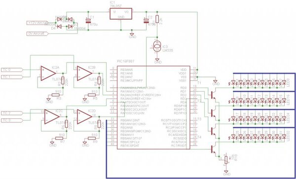 Circuit Explanation The top part of the circuit, comprising the 4 diodes, the two capacitors and the 78L05 voltage regulator are the power supply for the rest of the system. The 4 diodes are configured as a bridge rectifier, so that the gauge will be immune to somebody hooking it up to the power the wrong way around. The two capacitors are just providing filtering for the 7805 regulator, to smooth out any supply/demand ripples. The second part of the circuit is R1 and the LM335 (the weird 2 circle looking thing). This is the temperature sensor that will be reading the temperature where the thermocouples connect to the circuit. This is so the PIC can use the temperature there to do a cold junction offset calculation, and get an accurate reading on the CHTs. Cold junctions for thermocouples are normally at 0 degrees C, so if its not you need to allow for the temperature difference. The output from the LM335 is connected to AN0 (the first Analog to Digital converter on the PIC). The third part of the circuit is the 4 op amps (actually 1 TL074 chip) to the left of the PIC, which take their input from the 4 thermocouples (the other side of the thermocouple is connected to circuit gnd). These op-amps are configured to provide a voltage gain of 243 (roughly), which is enough to bump the output of the thermocouple up to about 1V at 100 degrees C (and 2V at 200 C etc). The 4 op-amps have their output connected to AN1-4, which are Analog to Digital converter pins for the PIC. The big boxy thing in the middle is the PIC16F887, which is the microcontroller which will do the temperature reading from the LM335 and the thermocouples (via the op-amps). It will then display the output (scaled to predefined settings) on the LEDs connected to RB0-7. These will start switching on when the CHTs get up to operating temperature, with the 6th (the last green) coming on a bit before the top of the engine's operating range. The first red (7th) will come on right at the top of the operating range. If the operating range is exceeded the whole bank will flash on and off. Each bank of LEDs (on the right hand side) is controlled by a transistor, which is switched on by the PIC when its displaying that particular bank. Each bank is switched on and off very rapidly in turn (thousands of times a second), which gives the appearance of it being on continually. This allows the PIC to control the 32 LEDs with only 12 pins. The LEDs are connected in turn through a variable resistor, which is used to control the brightness. The remaining pins on the PIC are left empty for future expansion/features (such as additional display channels, a SD or MMC card for logging etc). Note that in its current state, the PIC could be replaced with a smaller version, such as a PIC16f886. Corrections to schematic: while writing this i noticed that IC2D (the 4th, or bottom right op-amp) is connected to RA4 - this should be RA5, which is the next pin down. -