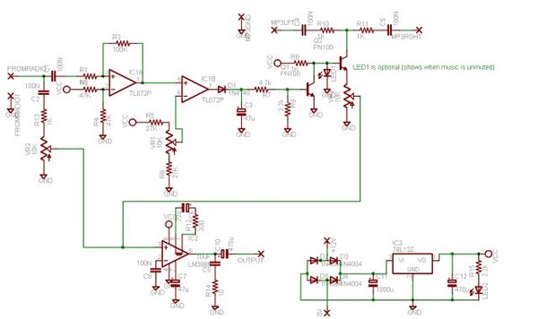 17. Sorry for the double post. Parts list: Qty Part Nos Description Cost/Unit Total Cost 5 c1,c2,c4,c5,c8 100N MKT Polyester capacitor $0.30 $1.50 2 c3,c7 47uF 16VW Electrolytic capacitor $0.28 $0.56 1 c6 22uF 16VW Electrolytic capacitor $0.20 $0.20 2 c10,c12 470uF 16VW Electrolytic capacitor $0.55 $1.10 1 c9 10uF 16V Tantalum $0.95 $0.95 1 c11 1000uF 16V Electrolytic $0.70 $0.70 1 d1 1N4148 Signal Diode (or similar - 1n914etc) $0.32 $0.32 4 d2,d3,d4,d5 1N4004 1A Rectifier Diode $0.40 $1.60 1 ic1 TL072 Dual Lown Noise JFET op-amp $2.35 $2.35 1 ic2 LM386N Low Voltage 1W Amplifier $2.10 $2.10 1 ic3 78L12Z 12V 100MA Voltage Regulator $1.00 $1.00 2 LED1,LED2 LED 15MCD 3mm or 5mm Some Colour $0.20 $0.40 2 Q1,Q2 PN100 General Purpose NPN (or similar) $0.25 $0.50 5 r1,r8,r10,r11,r13 1k 1/2watt 1% metal film resistor $0.38 $0.38 2 r2,r4 47k 1/2watt 1% metal film resistor $0.38 $0.38 1 r3 100k 1/2watt 1% metal film resistor $0.38 $0.38 2 r5,r6 27k 1/2watt 1% metal film resistor $0.38 $0.38 1 r7 4.7k 1/2watt 1% metal film resistor $0.38 $0.38 2 r9,r15 2.2k 1/2watt 1% metal film resistor $0.38 $0.38 1 r12 330 ohm 1/2watt 1% metal film resistor $0.38 $0.38 1 r14 10 ohm 1/2watt 1% metal film resistor $0.38 $0.38 3 vr1,vr2,vr3 10k Log Potentiomenter 16mm $1.75 $5.25 1 mp3 input 3.5mm stereo switched pcb socket $1.00 $1.00 1 radio input black 6.5mm mono phono line plug $0.85 $0.85 1 head output 6.5mm mono chassis socket - unswitched $1.35 $1.35 Total: $24.77 Based on Jaycar (http://www.jaycar.com.au) prices