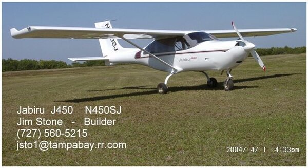11. Greetings, I just registered after finding a link to this site on the Yahoo Jabiru Engines group messages board. I fly a Jabiru J450 (N450SJ) from St Petersberg-Clearwater Int airport (KPIE). We are on the west coast of Florida on Tampa Bay. I have about 160 hr on N450SJ, after building it over a period of 14 months. I have also perviously owned a Piper Cherokee 140, and a Cessna 172L. My background is 30 years of aerospace manufacturing with Honeywell Space Systems Division. My J450 took 503 hrs for standard features and 702 hrs of customization before the first flight. It continues to evolve as I revise my objectives. I am a biased Jabiru owner and volunteer at the Jabiur boothes at the Oshkosh and Sun-N-Fun airshows, discussing the build experience and aircraft operation. I have posted photos on the Yahoo user group site of some of my customizations.