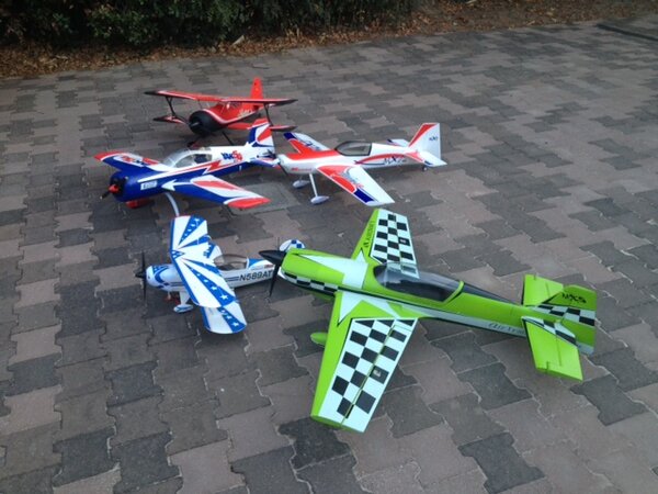 This is how my current aerobatic fleet stands. Dynam Pitts Python, E-flite Yak54, ST-Models MX2, and Hobby King Pitts and MX2. I realised after I took the picture that i'm missing the Ultra-micro sbach 347 and Pitts Beast from the picture.