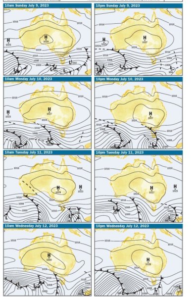 I find it very interesting that my knowledge of local weather gained from living most of my life in Southwest Sydney or the Southern Highlands is near useless now I live further north. Looking at this synoptic chart, I would be expecting strong south-westerly winds here, but it has been calm. You can see from the forecast synoptic charts that the strong High tends to block the Low from coming much further north than the Murray River and the pressure gradient lessens along a diagonal between the mouth of the Murray and the NSW Central Coast. About 30 kms south of Gilgandra is the boundary between the Macquarie River catchment and the Castlereagh River catchment. It seems to mark a rainfall boundary as well. There's a little village close by the boundary where the rainfall is less than surrounding towns and villages. In describing the rainfall totals there, the locals say that when it rained on Noah for forty days and forty nights, they only got forty points.