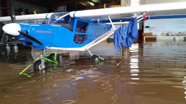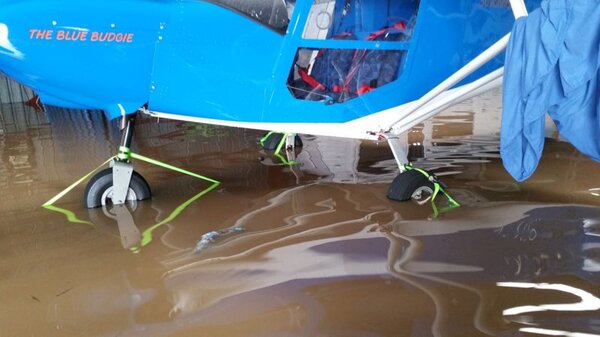 Put the plane back into the hanger and sent my wife home with my sons as the water was starting creeping into the hangers. i thought i'd stay and help out other fellow aviators to get their planes to a high ground (The mound that was put in by the council after the 74 floods) which you can see in the aerial photo. Most people managed to get their planes onto the mound, but some people were either cut off and couldn't get to the aeroclub or were dealing with other flood drama.Once the water started coming up, it came up very quickly and some planes went under.