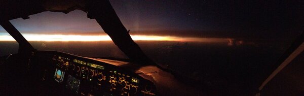 2. Panorama taken at sunset over the North-West Cape heading to Singapore. Clear skies to the west. Lurking in the darkness just right of track are intense storms at 80-100 nm topping out above 40,000ft, visible in the photo on the nav display.