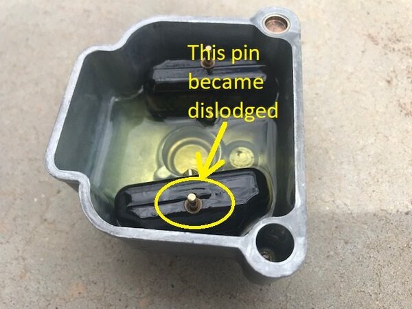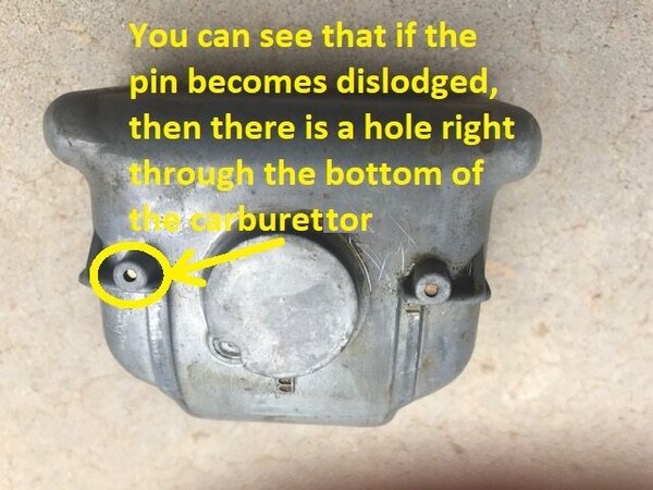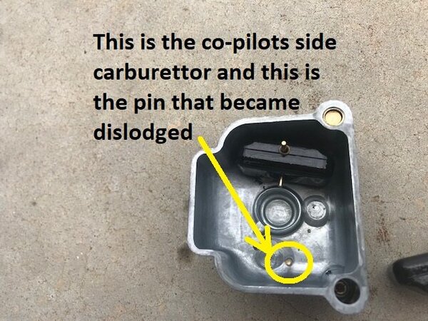 On the removal of the bowl, it was found that the outer float was laying over in the bowl along with its holding pin.