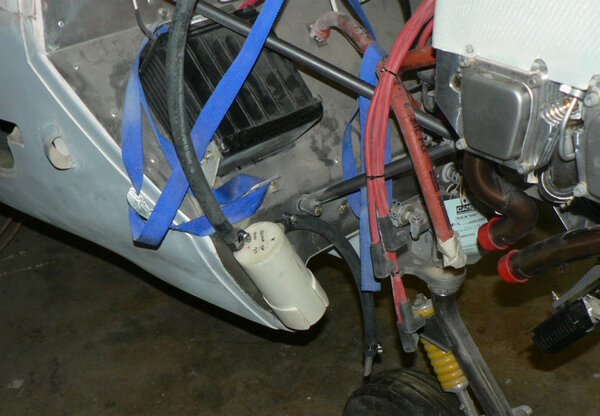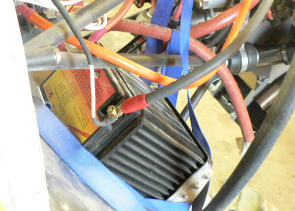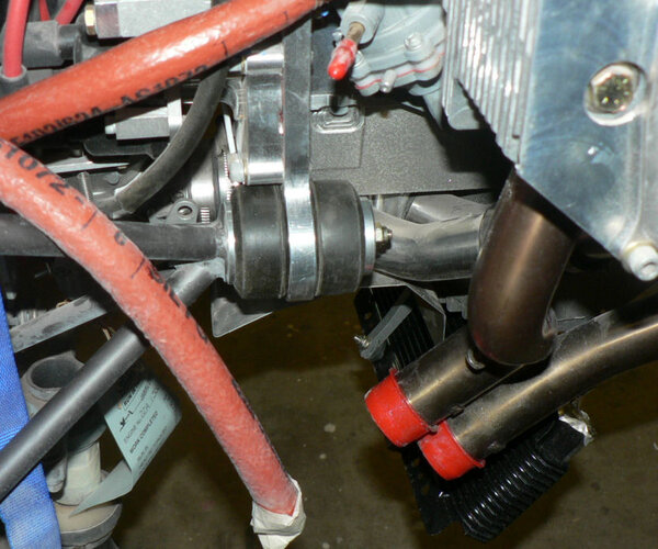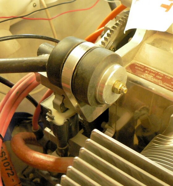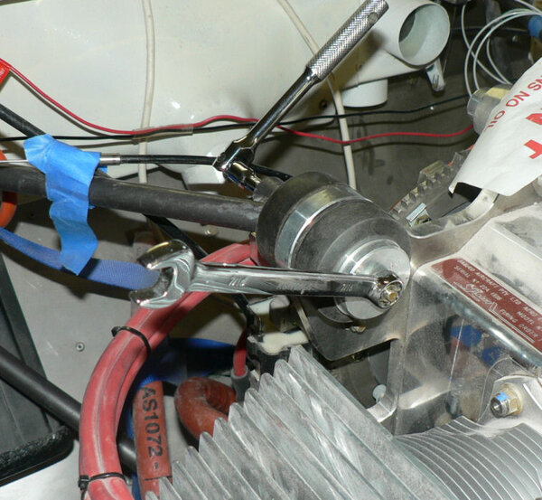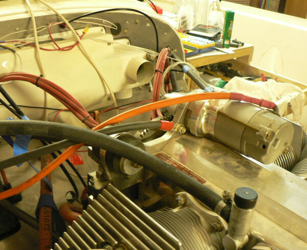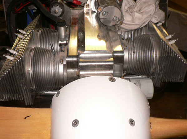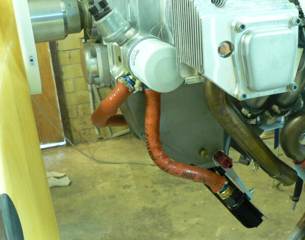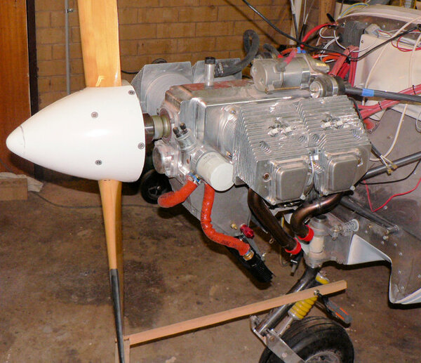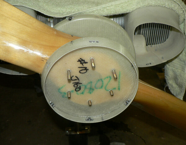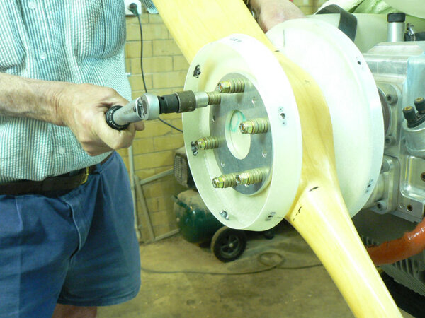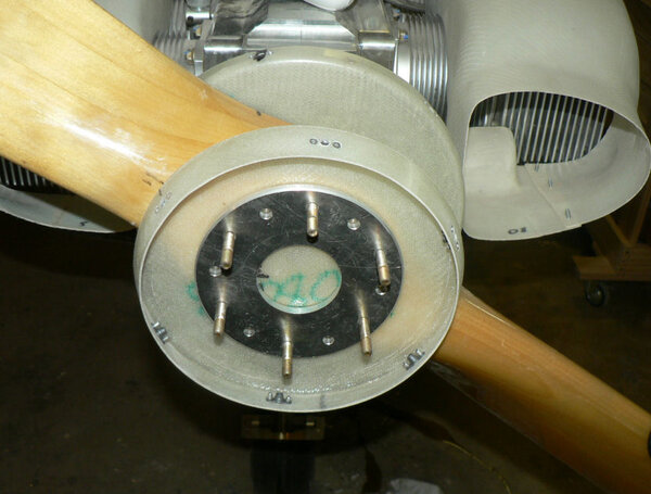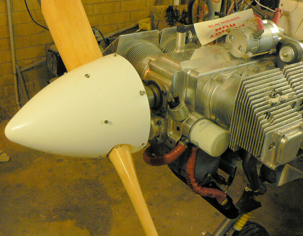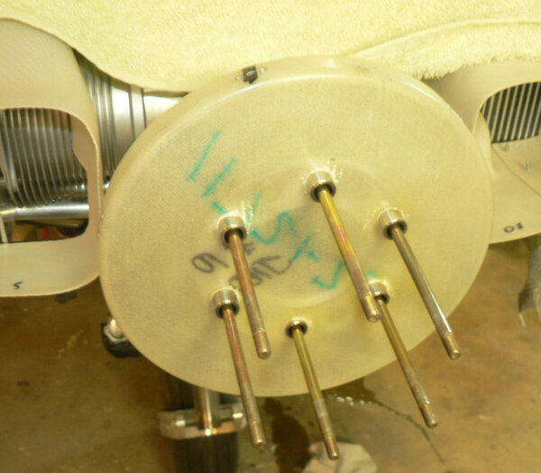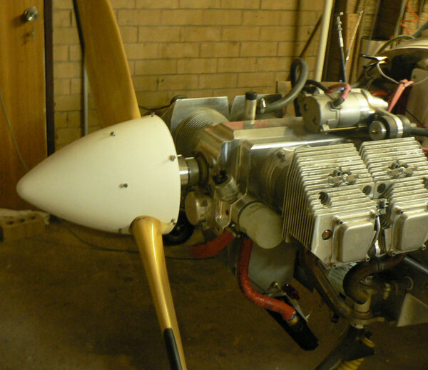 22-10-2007 Pic 1: Fitted oil cooler adapter at oil filter. It has been installed with O ring side facing the engine otherwise filter oil flow could be shut down. There is a small bypass hole built into my adapter. Fitted the oil cooler hoses to adapter and oil cooler with fire retardant cover & clamps. Jabiru (prop bolt kit) packet arrived in mail today with;- 7 x Nyloc nuts AN4 49 x Bellville washers 9 x Flat washers 6 x Bolts AN4-37A with I think it was X 010 on the head. Removed superseded prop bolts. Fitted new prop bolt bolts each bolt with 8 Bellville washers, 1 flat washer and a Nyloc nut. Pic 2: Nuts tensioned to 6 pounds feet or 72 inch pounds in about three stages in order of #1 #4 #2 #5 #3 #6 and repeated as necessary. Pic3: Bolts are too short by about 1 size unless a Bellville washer pair can be removed see third photo. Pic 4: Need to check tracking not done yet - but spinner prefitted. Pic 5: Engine earth strap made up and fitted from battery to engine Pic 6: Engine earth strap at battery end. Removed spark plug leads from spark plugs. Added 2 litres of Shell Aero Oil to engine Removed 1 spark plug from each cylinder Removed exhaust pipe and carburettor covers Turned engine over clockwise a number of times. Spun engine on starter motor for 20 seconds or so a couple of times. Pic 7: Replaced spark plugs, but not spark plug leads, exhaust pipe & carburettor covers and turned on battery charger. Wiring of hoses and plugs yet to be completed