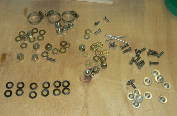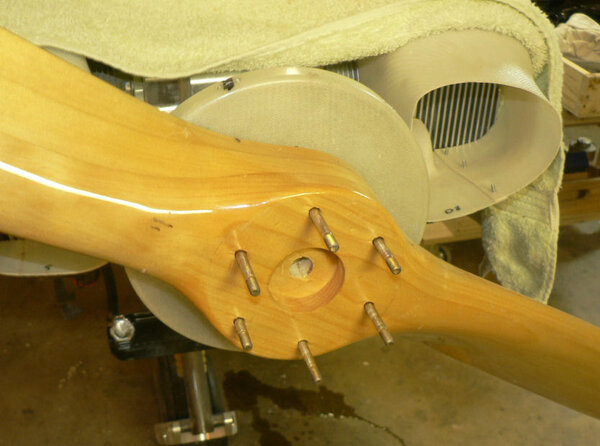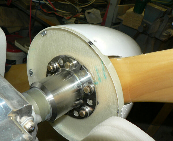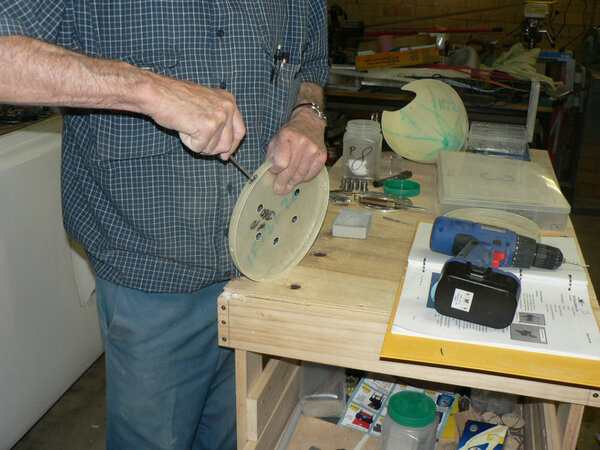 18-10-2007 This was more in the mode of an exploratory episode today not being able to complete the job because the prop connection is one of the things that has been changed so I do not have the new kit for it yet. Short description: enlarged the pilot holes in the 2 spinnner flanges out to 5/32"; used a retained nut with a screw in it as a jig for drilling all the rivet holes for the 12 retained nuts; Countersunk all the rivet holes so no rivets are proud of the flanges; Enlarged the 5/32" holes to 3/16" to give clearance for the SS CSK screws; Fitted all 12 retained nuts in the spinner flanges with 3/32" rivets; Fitted prop guides (bushes) after cleaning the holes in prop flange; the large spinner flange had to be heated before pushing over the prop guides - slight interference fit; Prop fitted - flywheel magnets at 6 o'clock & 12 o'clock with prop at 11 am; the spinnner flange and then the Aluminium backing plate were fitted with the bolts inserted from the engine side of the prop; It is apparent that I have not got the right bolts and not enough belleville washes - should be 48 bellevilles for the new arrangement! Tried fitting the spinner - it will have to be filed a bit to prevent it fouling the prop. Possibly I will have to experiment more with the alignment of the five pieces which the prop bolts go through plus the spinner. I will probably pack the prop bolts with a piece of wood so that I can continue work on the cowls and the spinner. Some of the contents of the prop card is in the last pic with the retained nuts installed, the prop guides installed and the bolts in w/o nuts, flat washers or bellville washers installed. Need personal photos in the log occasionally as evidence that I was here - check the fibreglass in my clothes.