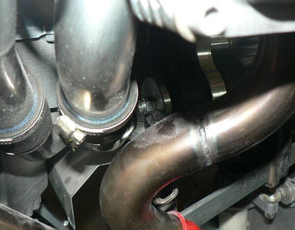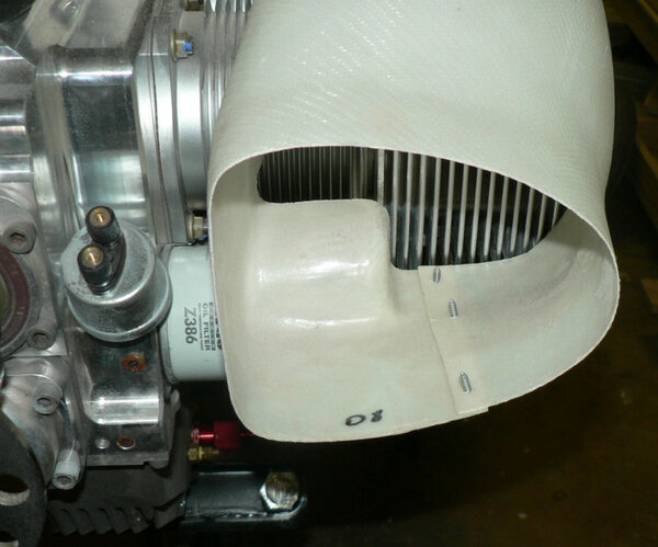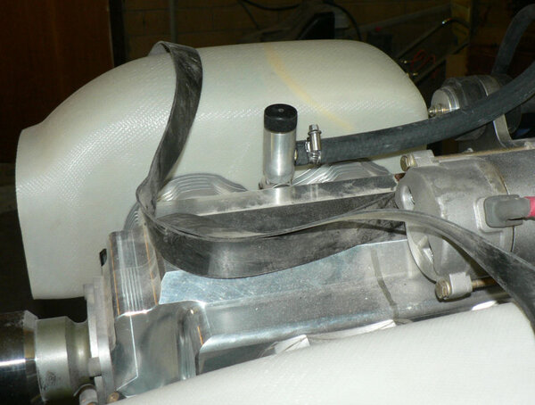 17-10-2007 Had another look at the engine mounting bolts and the construction book- decided I had the bolts in the wrong way and should have had heat proof nuts on them. Rectified that. From the pics you can see that the clamp I am using to compress the engine mount rubbers could be modified so that the socket spanner will fit through a hole at the non screw side of the clamp so that the clamp could be kept straight while pulling it up. I will have to braze or weld a slightly thicker piece of steel on that end with a hole in it big enough for the socket and washer to fit through. Attached the oil overflow reservoir and fitted the hoses - still need a clamp underneath to locate the overflow hose. Sat the air ducting on top of the engine cylinders - need to be reinforeced at the join with a couple of layers of glass. Wiil do that once it all looks ok. Need to set up the spinner backing plate, spinner flange and aluminium backing plate & propeller so that the spinner can be fitted and then the Cowls can be fitted to match the propeller boss.