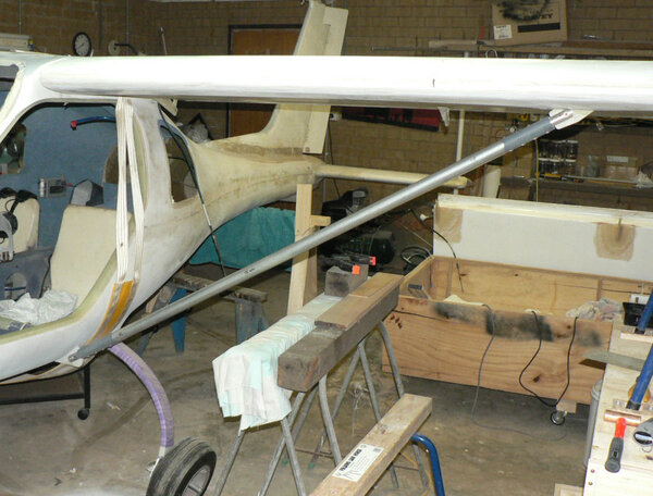2. 30-08-2007 Started off with the wing already attached to the a/c at the inner end of the wing and the outer end supported on a trestle on top of the moving bench. This made it easy to lever the wing up or down to match the strut holes. [ATTACH]3423.vB[/ATTACH][ATTACH]3422.vB[/ATTACH][ATTACH]3424.vB[/ATTACH] Mounted LH wing strut with strut end bolts put on top & nuts underneath. Had to rub down the NAS6605 19 0010 bolts to get them to match the fittings on the end of the strut and the SS lugs under the wing and on the underside of the cabin. Sanded some material off the lugs so that the strut ends would fit over the fibreglass lugs & SS bushes. Sanded a radius on the lug edges facing the strut to match the slot in the strut ends otherwise the strut would be deformed when bolted up at both ends. After getting the bolts to match the fittings then bolted up one end of the strut. Then heated that end SS bush and surrounding area and manipulated it so that the other end of the strut lined up with the other lug. Once it stayed lined up, then removed the bolt from the first lug. Fitted the second bolt to the other end of the strut and repeated the procedure above for the SS bush and lug at this end. Once the strut was lined up for the second time, refitted the first bolt. This can result in some binding of possibly both bolts again but at least they are in without breaking any thing. So then heated both SS bushes again to ensure that bolts were not binding when both ends of the strut were bolted up and attached to the wing & underside of the cabin respectively. So now at either end of the strut the bolt can be moved or removed relatively easily without any noticeable binding. This gave the heat gun a workout taking care not to apply enough heat to char or burn the fibreglass. The heat gun was used on a low setting and surprisingly only took a couple of minutes to make the material very pliable! A small piece of sheet metal was used to deflect most of the hot air from entering the wing via the space around the under wing lug. As you can see in the third photo, there is a problem with the alignment of the flap with the "eyebrow" which is not attached yet. The starboard eyebrow, attached to the fuselage before the wing & flap were mounted is similarly misaligned at this stage!