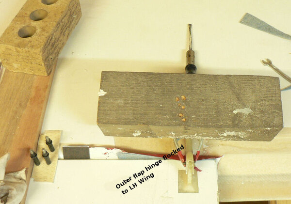 8-06-2007 Prepare Flap Hinge attach points for LH wing by cutting off lengths of bundy tube and filing to square them up. Clean out the SS bushes so that bundy tube fits with ends protruding. 9-07-2007 Prefit flap hinge support points to flap levers with an AN3-6A bolt through the bundy tube. Set up the LH Wing flap in position for fitting the flap hinge brackets - see photos for detail of position. Mix epoxy and epoxy flock & paint inner side of wing flap hinge brackets & wing position with epoxy after roughing with emery paper and cleaning with acetone. Fill U shaped brackets with flock and set in position on wing underside & maintain alignment with flap position. [ATTACH]2284[/ATTACH] [ATTACH]2285[/ATTACH] [ATTACH]2286[/ATTACH] [ATTACH]2287[/ATTACH] [ATTACH]2290[/ATTACH] Note the outer flap hinge position with peel cloth to stop sticking the wing to the flaps and some felt cloth behind it to keep it tight & prevent epoxy running down between the peel cloth and the wing like it did on the RH wing. [ATTACH]2289[/ATTACH] Keeping up the log book. Have to remember to put in the hours & keep a running total. Just had a look at the temperature - it had dropped to 18.9 C at 22:00 so turned up a fan heater - I do not like it - the cable gets hot :confused: - I shall have to modify it. The other fan heater is not a problem!;)