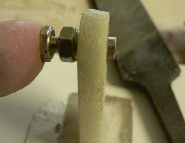 Cleaned up the aileron hinge mounting strip after flocking in place. [ATTACH]2022[/ATTACH] [ATTACH]2023[/ATTACH] [ATTACH]2024[/ATTACH] After building the frame on the wing box and mounting the RH wing in it, flocked in the three aileron pre-moulded reos for the RH wing. Hard to photograph no contrast between the reo covered on flock & background with flock on it as well. Also made up drilled spacers to facilitate drilling the holes to hold the hinges on the ailerons at their correct location. Two layers of scrap fibre-glass off cuts from trimming the flap supports were used as packers rather than trying to hold the hinges in place on a curved surface. [ATTACH]2025[/ATTACH] [ATTACH]2029[/ATTACH] Hinge set so space between aileron & wing will be thickness of hinge pin. Hinge held in place by M4 bolt.