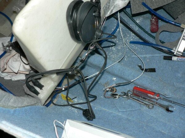 Hi Crew Realised the weekend was not over so did a bit more electrical panel stuff. Passed a piece of 12 gauge tie wire (tie wire for fencing) up the console from the aft end to draw the radio harness wires to the rear just behind the seats. Taped up the radio harness for the pilot & copilot microphone & headset jacks. Pulled the pilot & copilot jack wires through the console. Drilled two 3/8" holes to left side of pilot's seat for the pilot radio jacks. Despite both jacks needing the same size hole they have different nut sizes & so require two spanners to do them up 11 mm & 12 mm I think they were! Soldered the connections for the pilot side & copilot side radio jacks. Installed thepilot side radio jacks. Tried the radio reception for pilot side jacks - works fine with earphones and small speaker. Tried the intercom - can hear myself in the earphones - sounds fine so far. Still to put holes in the cabin lining for the jacks and re-glue the lining for pilot & copilot sides and clean up - vacuum etc). [ATTACH]819[/ATTACH] Photo taken through window hole behind the pilot seat showing the pilot radio jacks between the pilot seat & fuse wall. Also note both pilot & copilot wiring shown both yet to be secured under their respective beams behind their respective seats. The lining is yet to be holed to suit the jacks and re-glued. As you cannot see the jacks when you are flying I would really like them to be visible and accessible when you are airborne. There seems to be virtually no other conveneient location for them. The shiny item in the foreground is the power unit for the tail mounted strobe yet to be supplied with power.If it interferes with the radio I can shift it aft a foot or two with the mounting strips already fitted under the lining! Regards Ross
