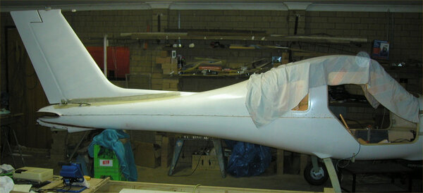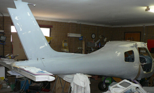The fuelage is half painted with a high fill paint to fill the pin holes,the bare fibreglass areas and the joins which I have alreadyfilled with a microball epoxy. The microball epoxy was not used structurally only as a filler.It is fairly easy to work. I initially, after setting,use a paint scraper with a carbide blade on the filler then a rectangular random sander.