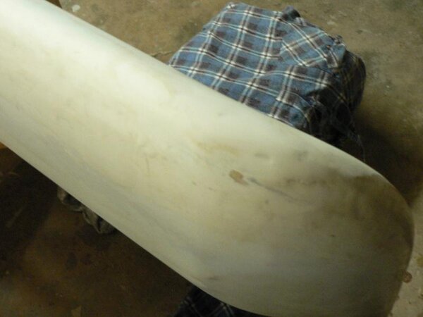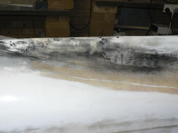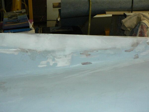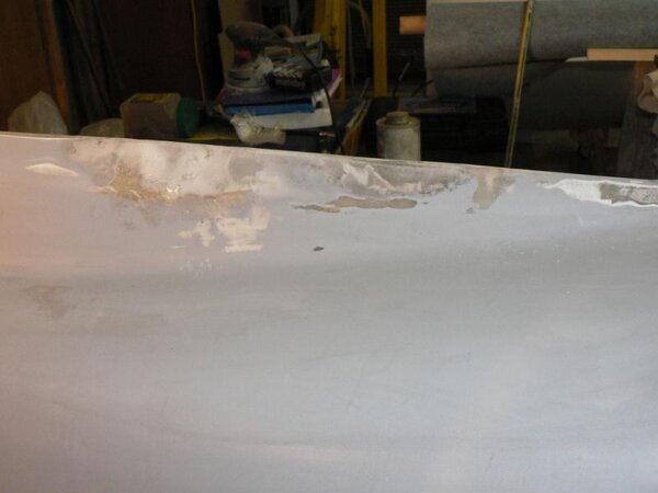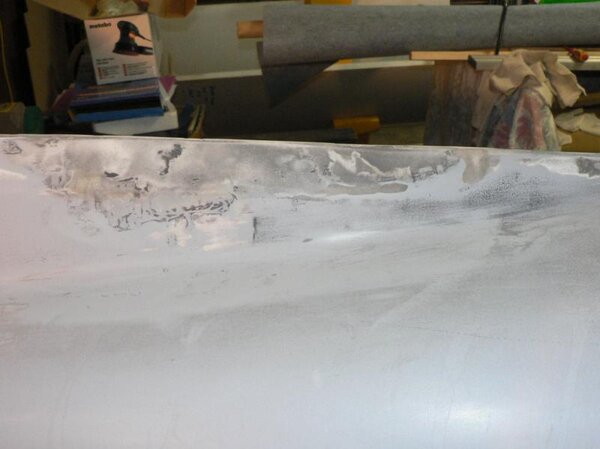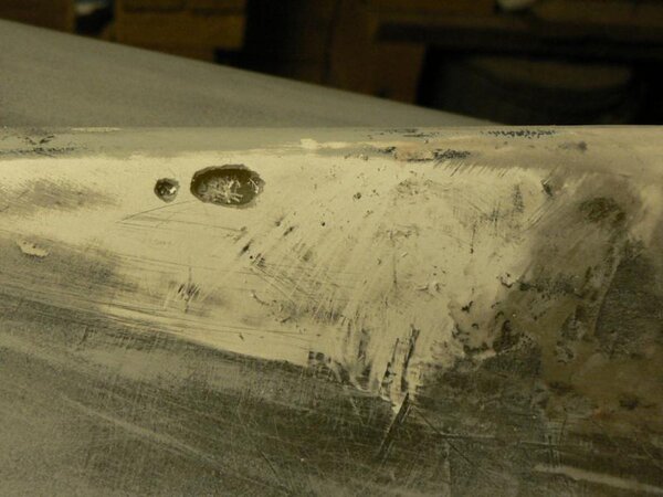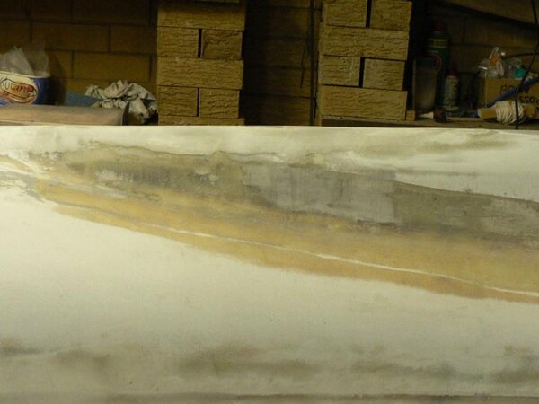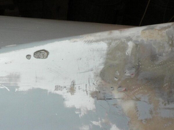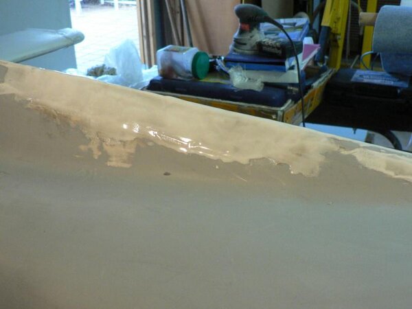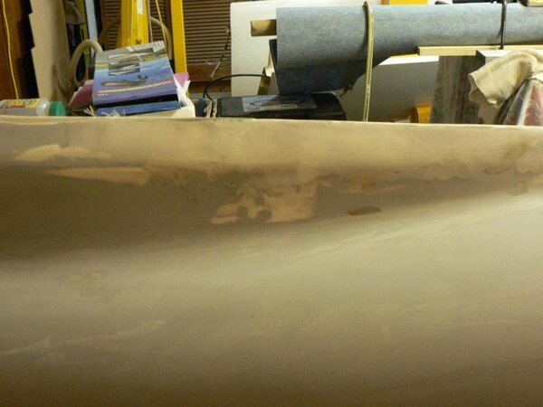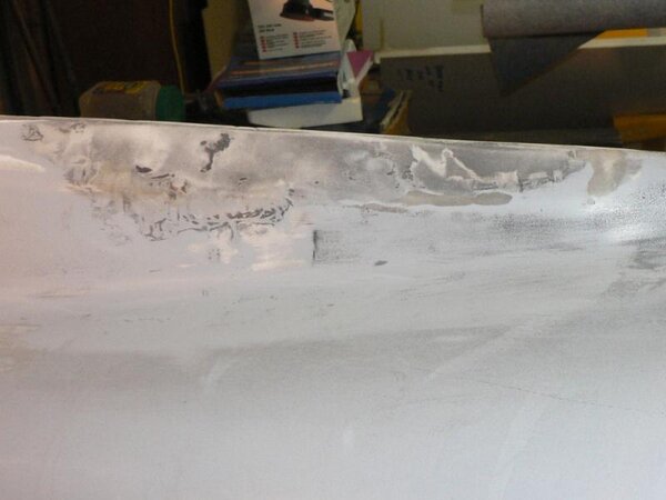 2-09-2008 Continued to rub down cable access cover area on pilot side. When enough done decided to remove spot spray from pressure pak can in low areas with a pocket knife. Found two of those spots were actually cavities in the gel coat with a paint like coat of gel coat across the top. Excavated them out and scored inside the cavity with the pocket knife to provide a key for eventual filling with epoxy micro-ball fill. Rubbed and scraped some more then cleaned up both sides using Acetone on a thick cotton rag to get the last of the pressure pak paint off. Rubbing back any more without applying more epoxy fill or paint undercoat would result in damaging the fibreglass. Despite a couple of relatively deep low points decided both sides will fill OK with the two part bogging undercoat applied with the low pressure spray gun as some areas around the vertical stabiliser to fuselage join will require probably at least three or four layers of undercoat. [ATTACH]6370.vB[/ATTACH][ATTACH]6371.vB[/ATTACH][ATTACH]6372.vB[/ATTACH][ATTACH]6373.vB[/ATTACH][ATTACH]6374.vB[/ATTACH] The last pic is of the passenger side after cleaning up with acetone. Could still partly fill those small depressions before applying the paint especially the two cavities in the gel coat.