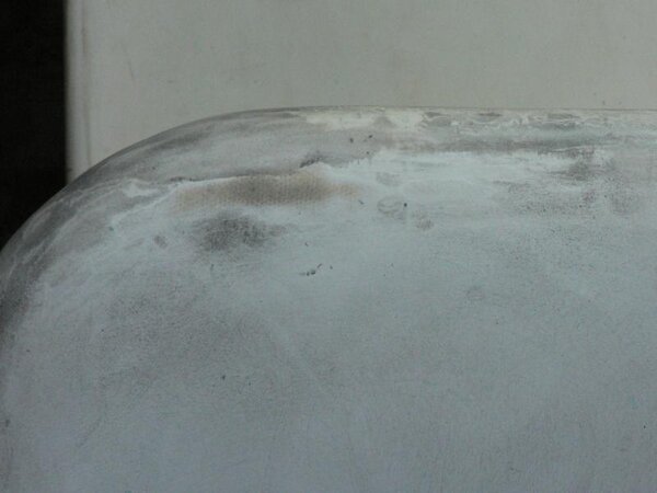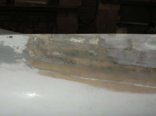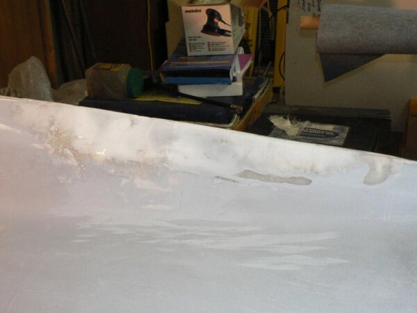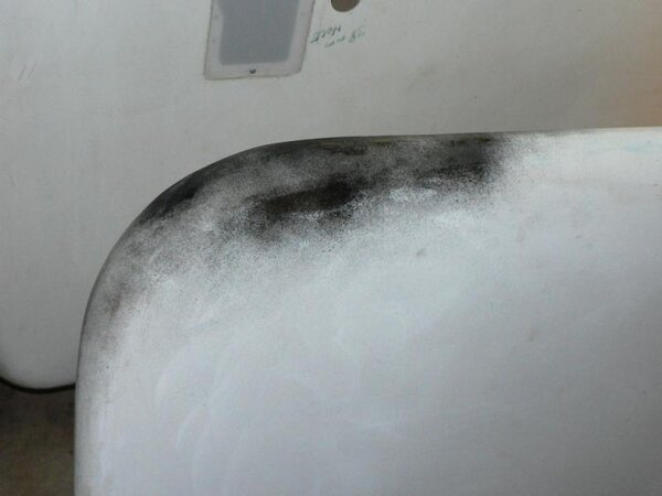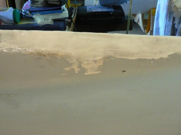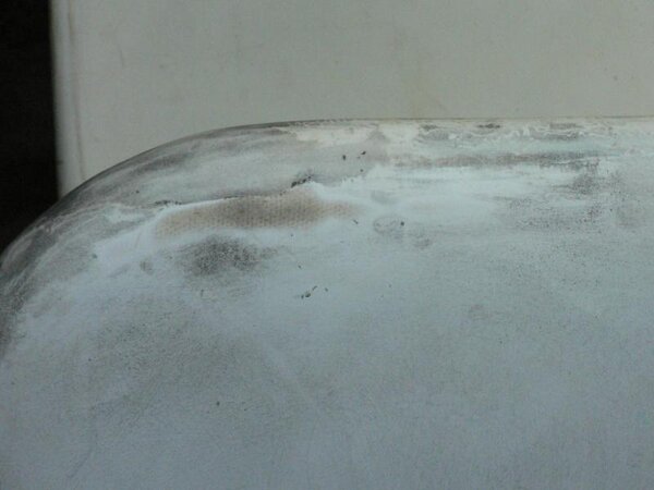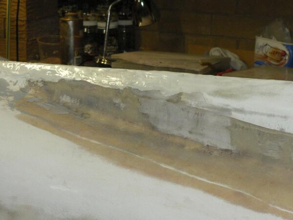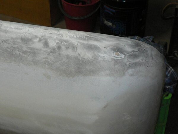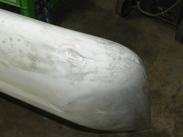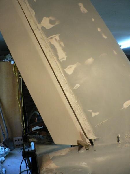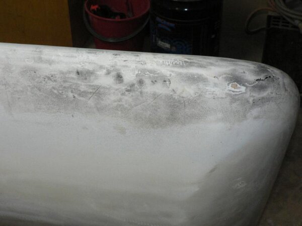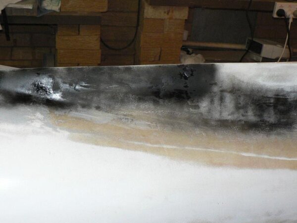 2-09-2008 Continued to rub down cable access cover area on pilot side. When enough done decided to remove spot spray from pressure pak can in low areas with a pocket knife. Found two of those spots were actually cavities in the gel coat with a paint like coat of gel coat across the top. Excavated them out and scored inside the cavity with the pocket knife to provide a key for eventual filling with epoxy micro-ball fill. Rubbed and scraped some more then cleaned up both sides using Acetone on a thick cotton rag to get the last of the pressure pak paint off. Rubbing back any more without applying more epoxy fill or paint undercoat would result in damaging the fibreglass. Despite a couple of relatively deep low points decided both sides will fill OK with the two part bogging undercoat applied with the low pressure spray gun as some areas around the vertical stabiliser to fuselage join will require probably at least three or four layers of undercoat. [ATTACH]6370.vB[/ATTACH][ATTACH]6371.vB[/ATTACH][ATTACH]6372.vB[/ATTACH][ATTACH]6373.vB[/ATTACH][ATTACH]6374.vB[/ATTACH] The last pic is of the passenger side after cleaning up with acetone. Could still partly fill those small depressions before applying the paint especially the two cavities in the gel coat.