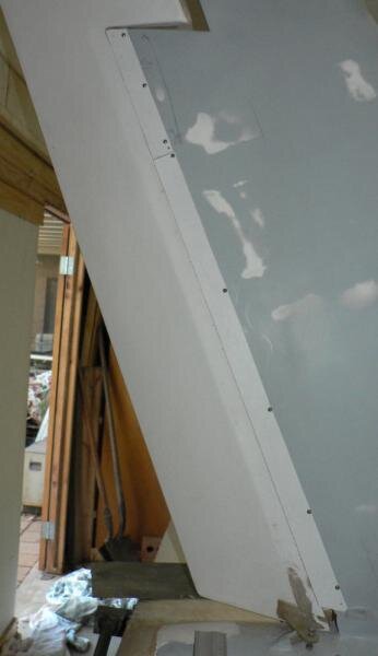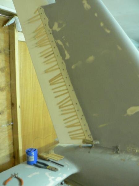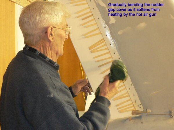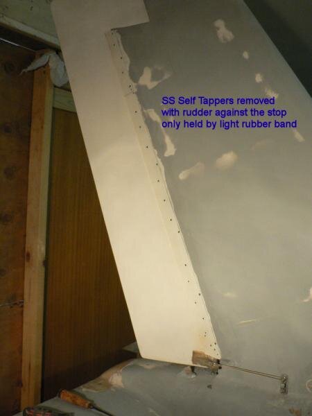 08-09-2008 Fitted rudder to check rudder clearance against new gap cover strip. Applied hot air from hot air gun to cover strip as it was moved over against the rudder stop at "full right rudder" position. Once that was achieved with rudder touching the cover strip - tied the rudder with lock wire against the stop. [ATTACH]6432.vB[/ATTACH][ATTACH]6433.vB[/ATTACH][ATTACH]6434.vB[/ATTACH] Applied more heat to the cover strip and inserted mixing sticks (paddle pop sticks) as spacers between the cover strip and the full right rudder position. Allow the cover to cool and set in position with mixing sticks maintaining clearance. Removed mixing stick spacers. Rudder now will hold full right position using only a light rubber band to hold it against the stop. Removed the SS self tappers. [ATTACH]6435.vB[/ATTACH][ATTACH]6436.vB[/ATTACH][ATTACH]6437.vB[/ATTACH][ATTACH]6438.vB[/ATTACH][ATTACH]6439.vB[/ATTACH] Cleaned up around the self tapper holes using orbital sander and then ethanol. Mixed up micro-ball epoxy filler and filled self tapper holes and along leading edge and trailing edge of join of cover strip to vertical stabiliser. [ATTACH]6440.vB[/ATTACH][ATTACH]6441.vB[/ATTACH][ATTACH]6442.vB[/ATTACH][ATTACH]6443.vB[/ATTACH][ATTACH]6444.vB[/ATTACH] Allowed to cure with heater to keep the temp up. Winter is not quite over in our garage.