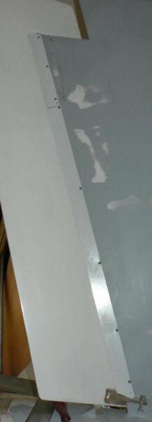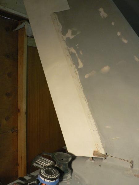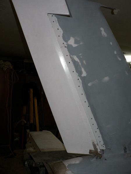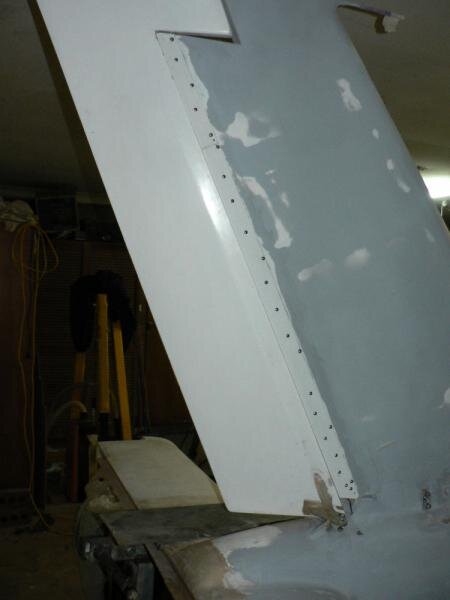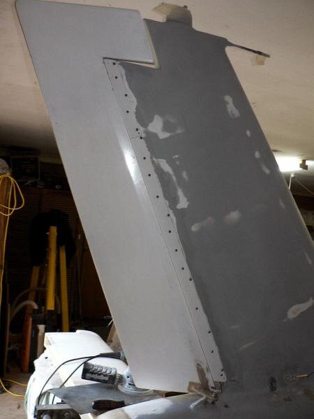 09-09-2008 Scraped the the high spots off the micro-ball epoxy fill used on the rudder gap cover both on the starboard outside of the vertical stabiliser and on the inside of the channel at the aft end of the vertical stabiliser. Then used the orbital sander on the cover strip and join area of the vertical stabiliser. [ATTACH]6449.vB[/ATTACH][ATTACH]6450.vB[/ATTACH][ATTACH]6451.vB[/ATTACH] The light rubber band will still hold the rudder against the stop. Because the rudder hinges are on the port side of the rudder and the mass balance weight on the top of the rudder, the rudder tends to sit at almost full left rudder when not connected to the rudder cable. Epoxy Micro-ball fill is difficult to use on a vertical surface as it remains plastic for so long before curing in the cool temps we are experiencing in late afternoons and nights. If it is used very stiff there may not be enough epoxy available in the mix to give good bonding with the underlying surface. So I will need to use the two part bogging undercoat to make a good base for the top coat in this area.
