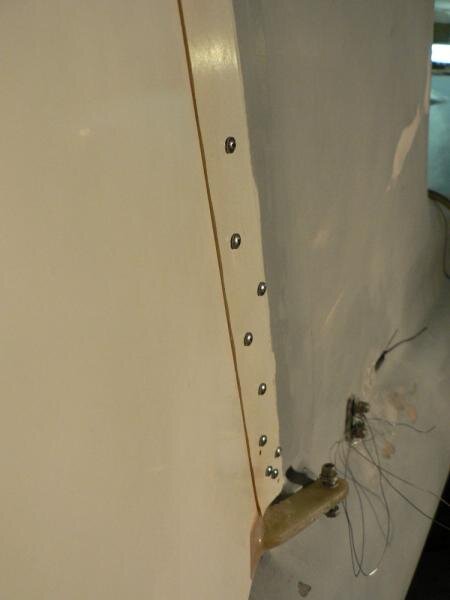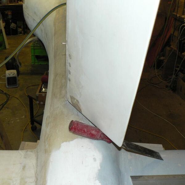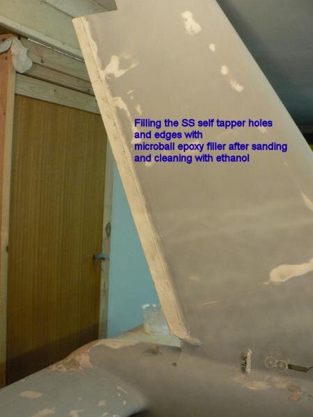 07-09-2008 Removed the strip over the gap by removing the SS self tappers used to hold it in place and prepared the surface for epoxy by removing the paint and the gel coat using an orbital sander with #240 grit sand paper. Also removed the red seal cloth from back of fibre-glass cover strip material before sanding back the leading edge of it back to a thin edge to match up with vertical stabiliser surface. Then cleaned up the surfaces with ethanol on a cotton rag. Made up a batch of epoxy flock to attach strip to vertical stabiliser. Applied flock to vertical stabiliser join area as well as the strip. Used SS self tappers to hold strip in place and inserted additional SS self tappers to hold the strip firmly in place. [ATTACH]6420.vB[/ATTACH][ATTACH]6421.vB[/ATTACH][ATTACH]6422.vB[/ATTACH][ATTACH]6423.vB[/ATTACH][ATTACH]6424.vB[/ATTACH] Wiped off excess flock with rag soaked in ethanol. Had to use heater to keep the temperature up for curing the epoxy.