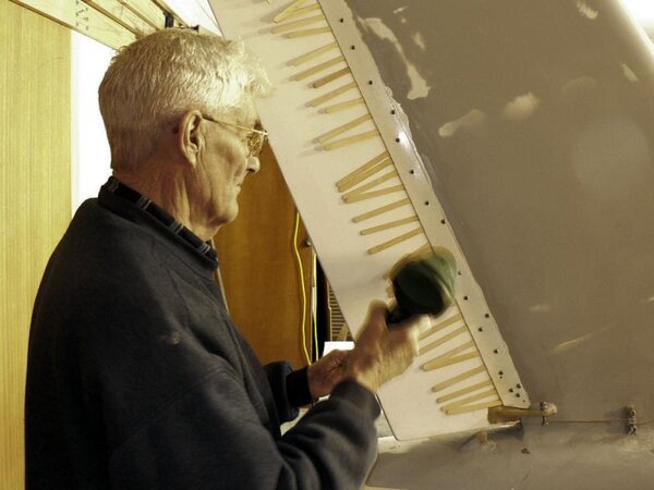 4-09-2008 Used a rotary random orbital sander with #240 grit self adhesive sandpaper with vent holes. The the sander is fitted with an exhaust bag to "collect" the dust. Wore a face mask as essential equipment during any sanding. [ATTACH]6394.vB[/ATTACH][ATTACH]6395.vB[/ATTACH][ATTACH]6396.vB[/ATTACH][ATTACH]6397.vB[/ATTACH][ATTACH]6398.vB[/ATTACH][ATTACH]6399.vB[/ATTACH] The bogging undercoat will be essential to finish off these areas around the tail group and the strut fairings on the underside of the wings. Any further machine sanding at this stage will be too deep on the existing fill.