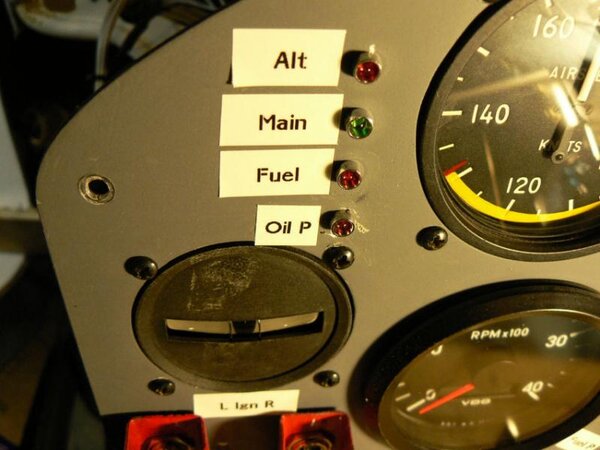 20-08-2008 Used the "W" terminal on the oil pressure sensor to run a lead back to a new LED on the panel. Installed the new LED below the other LEDs on the panel and ran a lead back to the "instrument bus" to supply the power when it is operational. Once it was wired up, tested it as follows. On turning on the main switch the low pressure LED turned on. On operating the starter motor, once the oil pressure came up on the pressure gauge the LED light went out. [ATTACH]6540.vB[/ATTACH][ATTACH]6541.vB[/ATTACH] Once the starter motor was released and the pressure dropped the warning "LED" was illuminated again until the main switch was turned off.:thumb_up:
